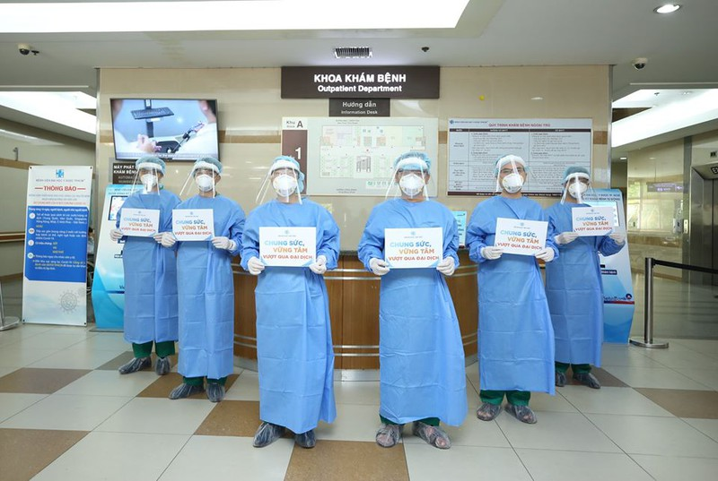 Các bác sĩ Bệnh viện Đại học Y Dược TP.HCM với khẩu hiệu "Chung sức, vững tâm, vượt qua đại dịch".
