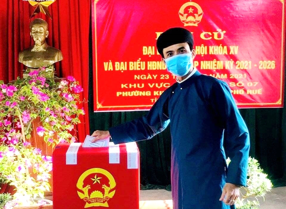 Hưởng ứng lời vận động của Sở Văn hoá Thể thao tỉnh Thừa Thiên - Huế, sáng 23/5, nhiều cử tri là cán bộ, người lao động của các cơ quan thuộc Sở mặc áo dài ngũ thân đến các điểm bỏ phiếu để thực hiện quyền và nghĩa vụ bầu cử.