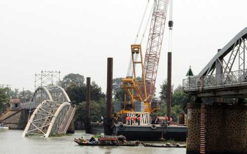 Quan sát tại hiện trường, chiếc sà lan được xoay ngang móc vào nhịp 2 đang treo để các thợ lặn tiếp tục cắt và hạ xuống nước. Ngoài ra 4 ống sắt neo cố định đã được lực lượng thi công thực hiện và trong chiều nay sẽ tiếp tục các bước tiếp theo.