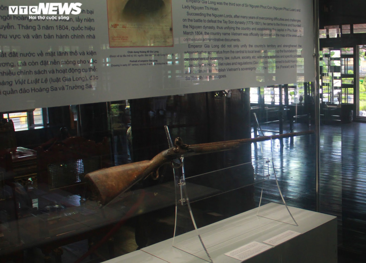 Hiện trong Bảo tàng Cổ vật Cung đình Huế còn lưu giữ, trưng bày hơn 40 hiện vật gắn liền với triều đại hoàng đế Gia Long. Trong hình là súng điểu thương, kỷ vật gắn bó với vua Gia Long thời chinh chiến. Sau khi lên ngôi, kỷ vật này được lưu giữ và về sau ban tặng cho vua Minh Mạng và được vua Thiệu Trị xác nhận là bảo vật truyền đời của triều đại, khắc lên súng để ghi nhớ. (Ảnh: LC).