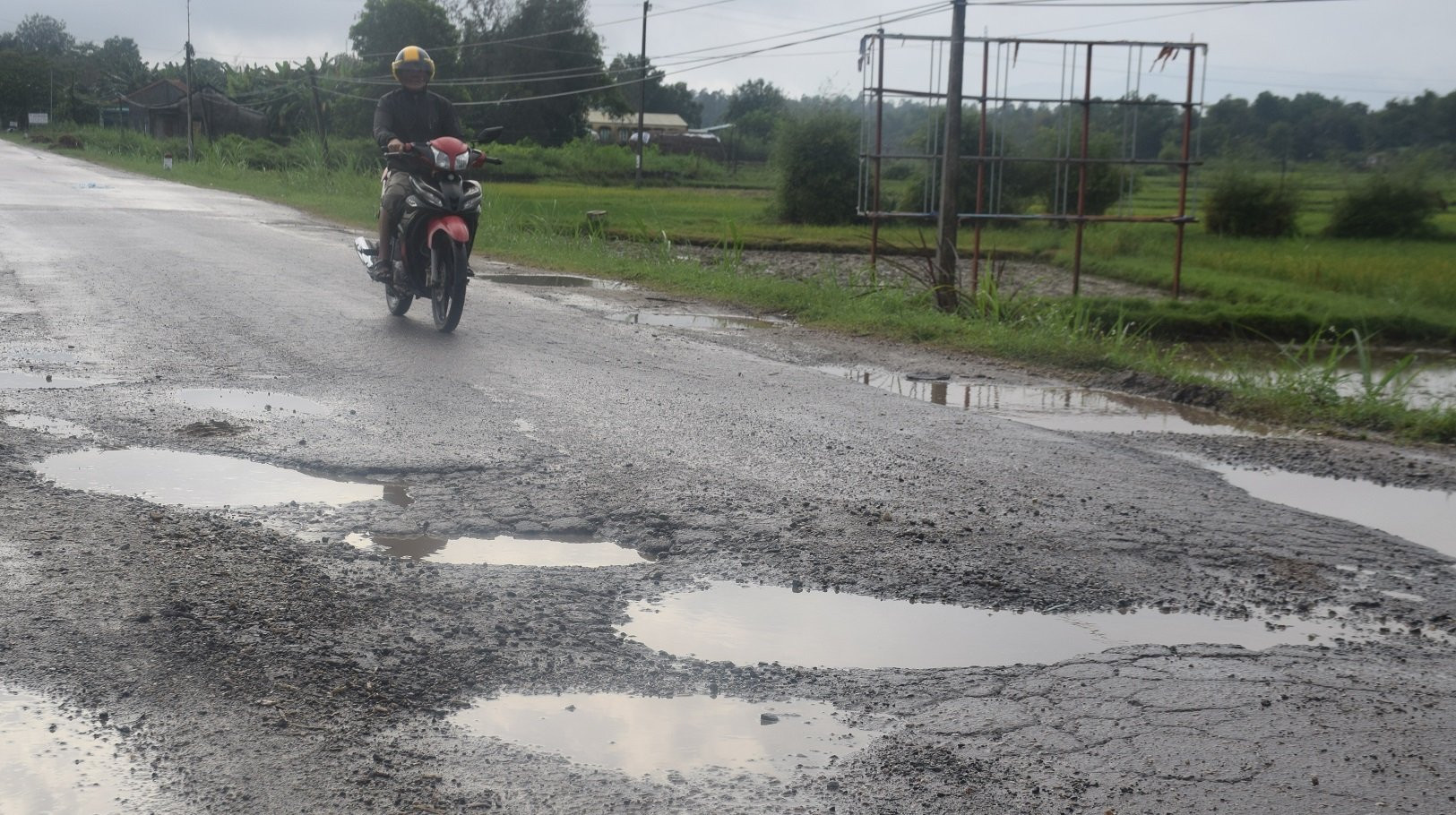 Mặt đường nhựa bị đục khoét và vô tình trở thành nơi chứa nước mưa.