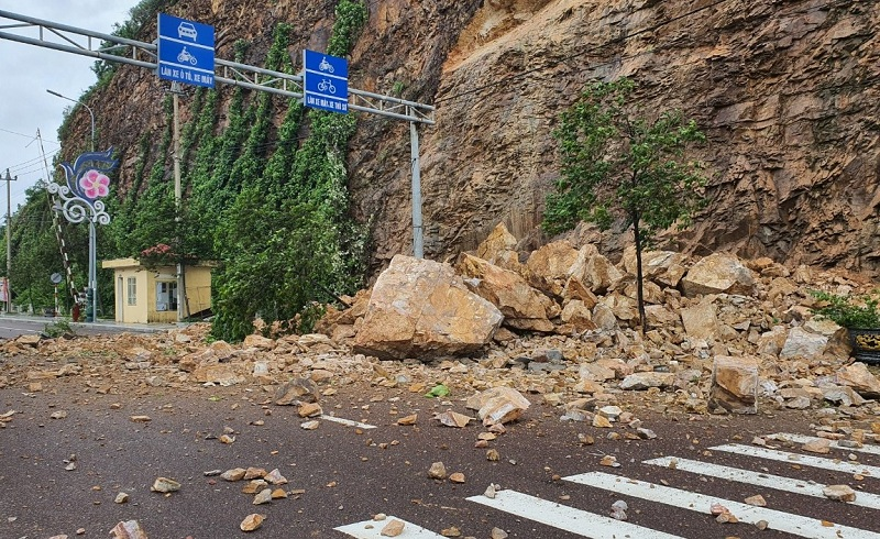 Khoảng 8h ngày 25/10, một lượng lớn đất đá trên núi Bà Hỏa, nằm sát đường Nguyễn Tất Thành (phường Lê Hồng Phong, TP Quy Nhơn, tỉnh Bình Định), bất ngờ đổ ập xuống đường.