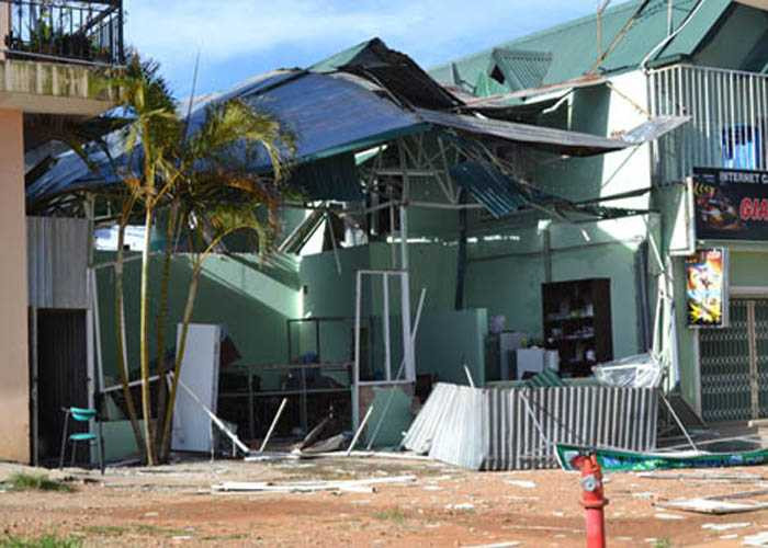 Tòa nhà chung cư đối diện với quán ăn “Thịt cầy Hòa Bình” vừa xây xong bị xê dịch cửa sắt kéo, nhiều ô cửa kính trên các tầng lầu bị bể nát vụn. Tôn của quán ăn bị nổ bay tứ tung cách xa khoảng 40 m.