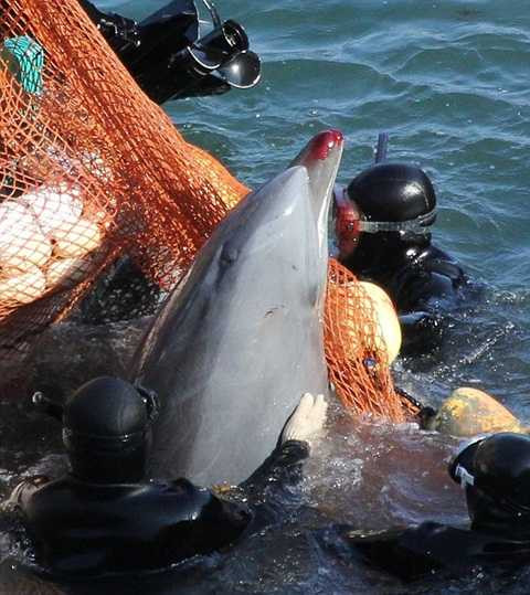Ngư dân dùng dây thừng trói cá heo cho tàu kéo đi. Trong năm 2011, khoảng 15% cá heo được nuôi nhốt