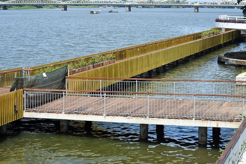 Hiện các lối dẫn xuống cây cầu gỗ lim siêu sang ở Huế tạm thời bị phong tỏa để đơn vị thi công hoàn thiện những hạng mục cuối cùng như đường điện, trụ đèn, hệ thống chiếu sáng nghệ thuật, cây cảnh…