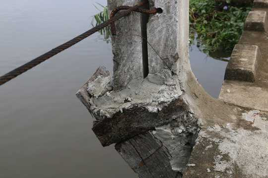 Người dân tu bổ bằng cách trám xi măng kết hợp với những phách gỗ vào thành cầu như thế này
