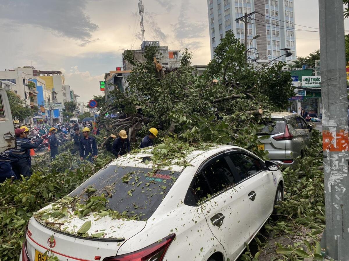 Thân cây đè lên hai ô tô 5 chỗ đang đậu trả khách ở gần đó. Hai tài xế may mắn thoát ra khỏi xe. Cây đổ còn làm hư hỏng một số quán ăn bên cạnh.