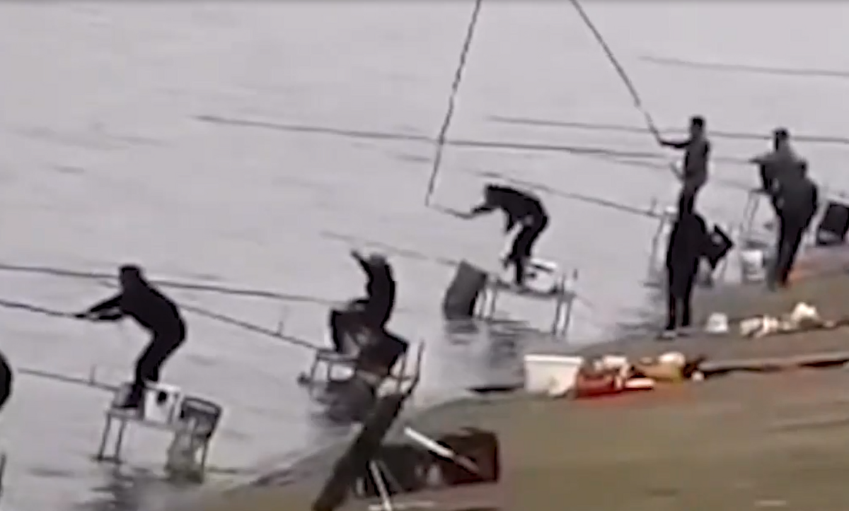 Chiếc cần câu bất ngờ gãy đôi khiến chàng cần thủ ngã lộn cổ xuống sông.