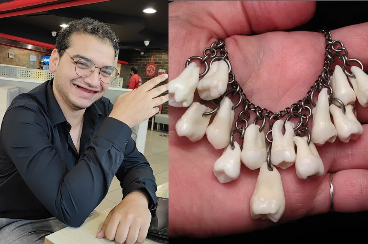 Và theo như những gì người tạo ra món trang sức này chia sẻ, những chiếc răng trang trí trên là hàng thật. Người tạo ra chiếc vòng sẽ mua răng từ các nha sĩ. Tất nhiên là nó đã được làm sạch và không có chút sâu nào.