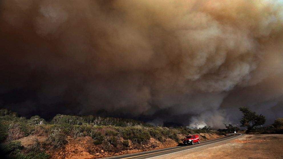 Một cột khói khổng lồ bốc lên trên Quốc lộ 1, hạt Santa Cruz, khi đám cháy lan tới bãi biển Waddell. (Ảnh: AP)