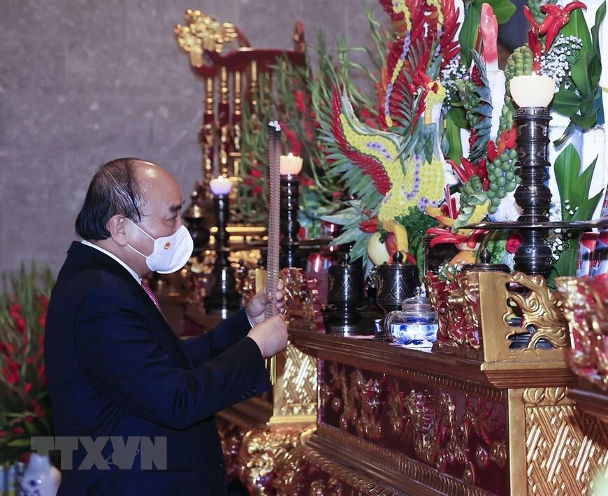 Chủ tịch nước Nguyễn Xuân Phúc dâng hương tại Lễ khánh thành Đền thờ Vua Hùng ở TP Cần Thơ. (Ảnh: Thống Nhất/TTXVN)
