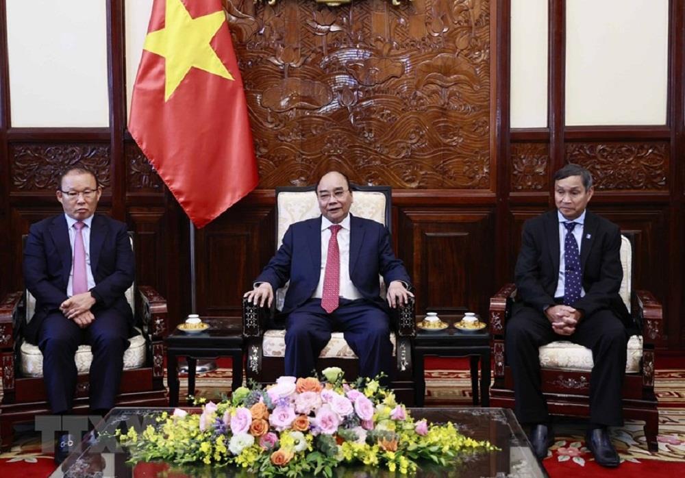 Sáng 28/5, tại Phủ Chủ tịch, Chủ tịch nước Nguyễn Xuân Phúc tiếp Huấn luyện viên bóng đá nam Park Hang Seo và Huấn luyện viên bóng đá nữ Mai Đức Chung. (Ảnh: Thống Nhất/TTXVN)