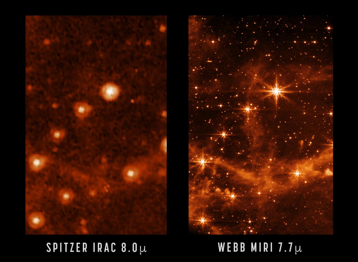 NASA cũng so sánh ảnh từ James Webb với ảnh chụp của Kính viễn vọng Spitzer, cho thấy chi tiết và độ sắc nét cải thiện rõ rệt. Trước khi được cho "nghỉ hưu" từ tháng 1/2020, Spitzer là kính viễn vọng đầu tiên có thể chụp ảnh vũ trụ độ phân giải cao bằng ánh sáng hồng ngoại gần và trung. Tấm kính khổng lồ của James Webb cho phép ghi lại nhiều chi tiết hơn so với Spitzer.