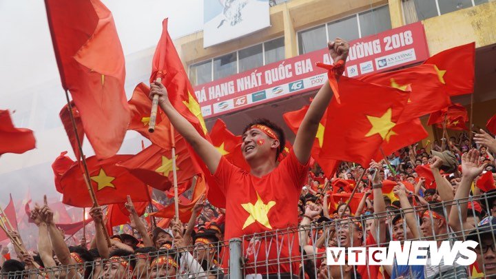 Khoảnh khắc cổ động viên ở sân vận động Hàng Đẫy, Hà Nội hò reo ăn mừng bàn thắng của cầu thủ Văn Quyết khi ghi bàn thắng gỡ hoà cho đội tuyển Olympic Việt Nam. (Ảnh: Phạm Chiểu)