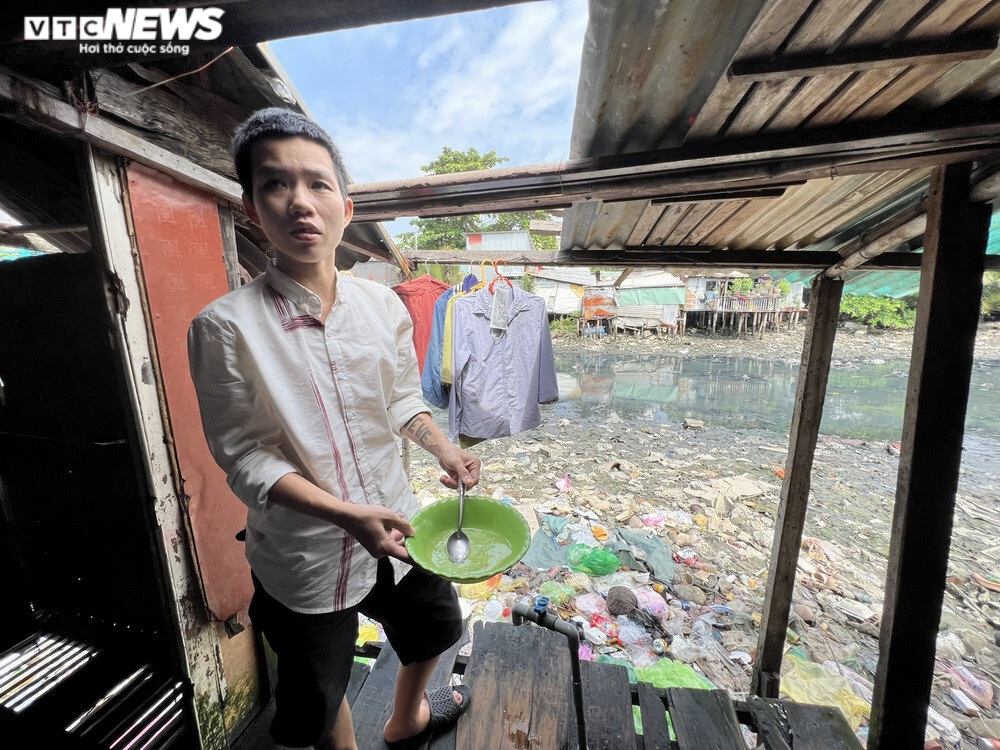 Sống ở đây hơn 4 năm, anh Lê Khánh (SN 1980) cho biết, những ngày nước lên sẽ đỡ mùi, nhưng khi nước rút, trời nắng thì mùi hôi thối không chịu nổi, nhưng ở riết cũng thành quen.