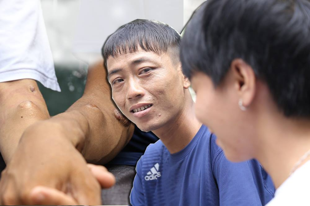 Trên cánh tay của ông chằng chịt những vết u cục thâm tím do phải chạy thận suốt 18 năm.