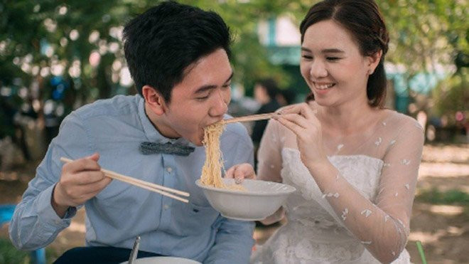 Cô dâu xinh đẹp, chú rể điển trai dường như quên hết trời đất khi nhìn thấy đồ ăn