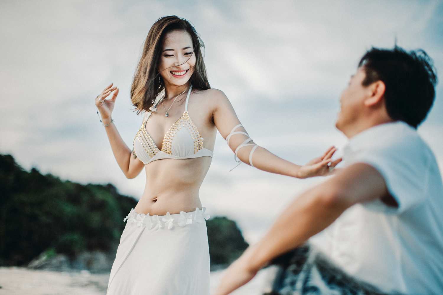 Hai người đã có những phút biểu diễn hết sức ngẫu hứng bên biển xanh, cát trắng. Với bối cảnh vô cùng phù hợp với trang phục và phong cách của hai nhân vật chính, bộ ảnh cưới đậm chất “tình” này thực sự là những khoảnh khắc khó quên của Linh – Trang.