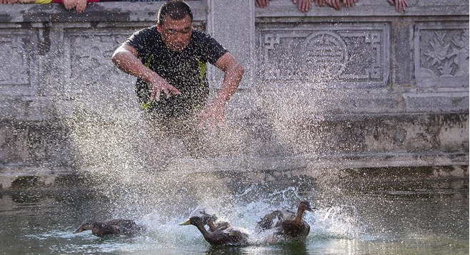Có 5 con vịt được ban tổ chức thả xuống hồ. Người dân đăng ký tham gia bắt vịt và thành công sẽ được thưởng từ 500.000 đến 1 triệu đồng.