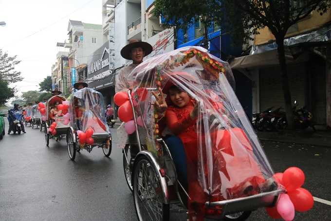 Màn rước dâu bằng xích lô dưới trời mưa đầy lãng mạn thu hút sự chú ý của nhiều người đi đường.