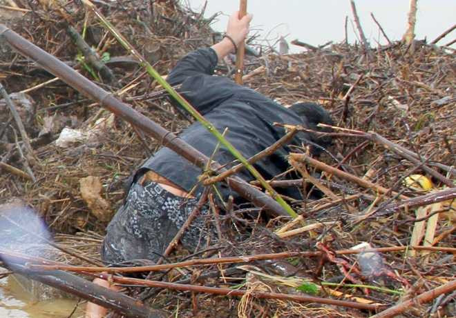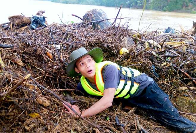 Nhiều thanh niên đã phải "dầm mình" giữa mưa, nằm rạp người xuống để tìm những khúc gỗ đang bị rác lấp phía trên.