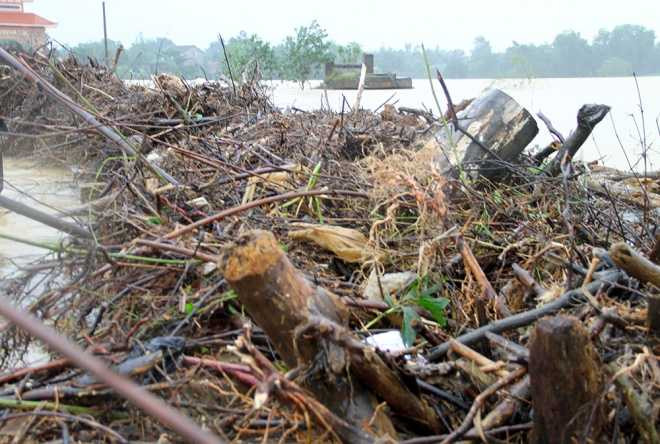 Tại cầu tràn thuộc thôn 10 xã Gia Phố (Hương Khê), nhiều khúc gỗ lớn dài 2 m trở lên, đường kính 50 cm từ vùng cao theo dòng lũ đổ về mắc kẹt. Gỗ nằm giữa dòng nước, xung quanh là củi và rác thải.