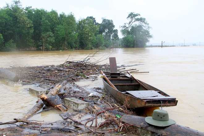 Sáng 2/11, nước lũ ở huyện Hương Khê (Hà Tĩnh) đang rút dần, nhiều loại gỗ và củi từ thượng nguồn đổ về hạ du, mắc kẹt ở một số cầu tràn.