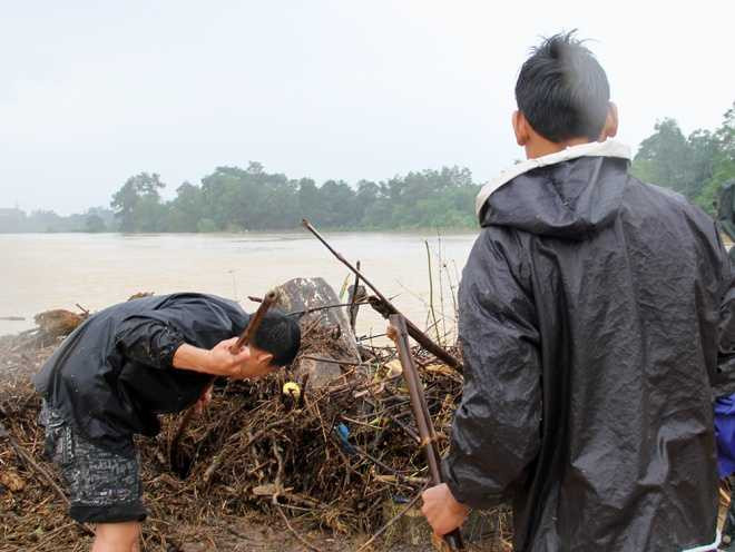 Tham gia vớt gỗ chủ yếu là thanh niên.