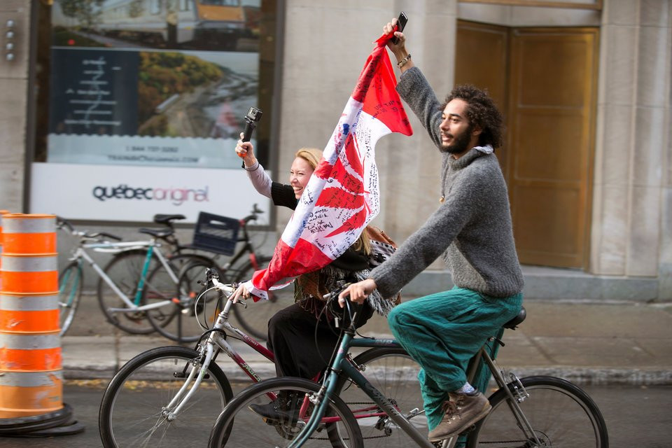Một số người còn mang trên tay lá cờ, thay vì lá phong đỏ, giờ là lá cần sa. (Ảnh: REUTERS/Carlos Osorio)