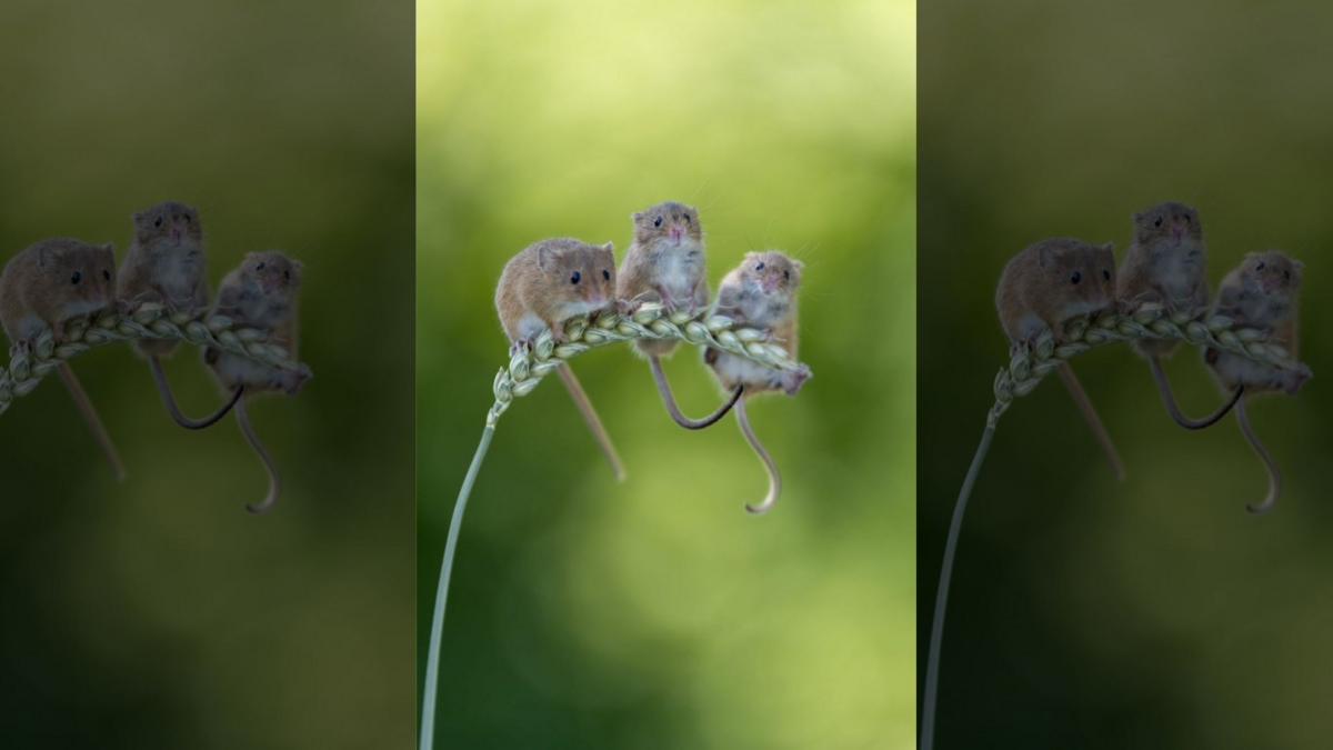 Trong bức ảnh, 3 con chuột dài khoảng 5-7 cm ngồi vắt vẻo ở phần trên cùng của bông lúa mỳ, chân cố gắng bám chặt để khỏi gã.