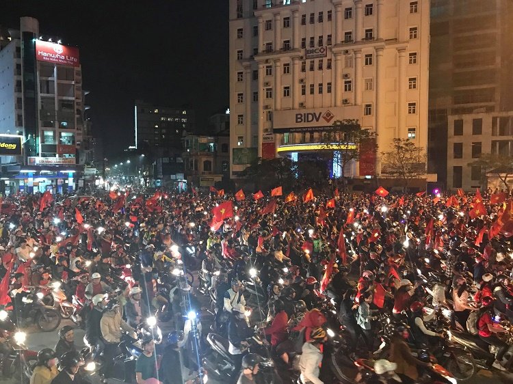 Dưới đây là một số hình ảnh người dân Huế đổ ra đường đông như trẩy hội mừng chiến thắng chấn động của U23 Việt Nam do PV VTC News ghi nhận: