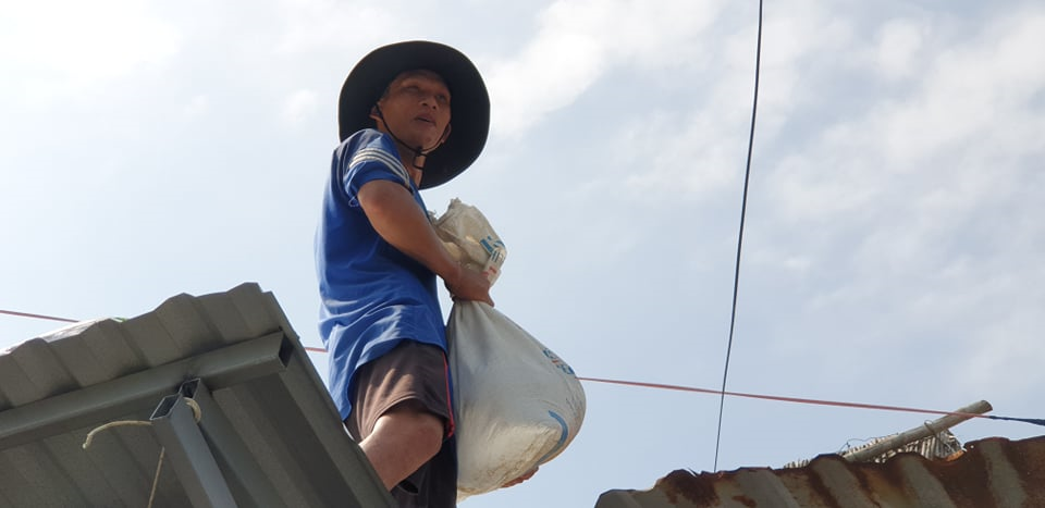 Họ đang kéo từng bao cát lên để gia cố mái nhà trước khi bão số 9 đổ bộ.