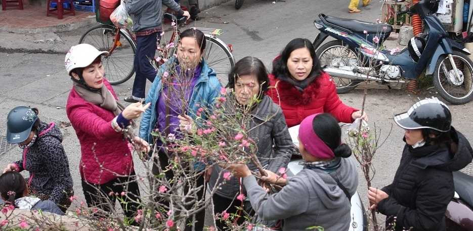 Mẹ đèo con đi mua cành đào bày bàn thờ ngày rằm tháng Giêng.