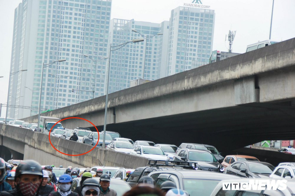Tại nút giao từ đường vành đai 3 xuống đường Nguyễn Xiển (Thanh Xuân, Hà Nội), dòng ô tô bị ùn ừ kéo dài. Thậm chí có lái xe máy còn phi ngược chiều lên đường cao tốc trên cao nhằm tránh tắc đường phía dưới.