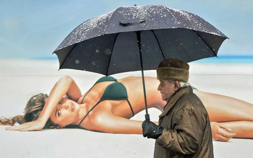 (VTC News) - Hình ảnh đẹp nhất ngày hôm nay là cụ ông cầm ô đi trong tuyết 'mặc kệ' người mẫu nóng bỏng mặc bikini trong tấm biển quảng cáo trên phố.