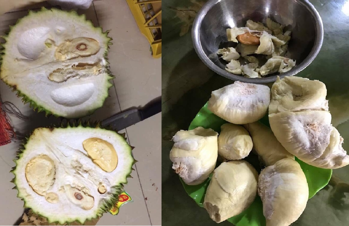 "Sầu hỏng, cơm trắng ởn ăn như khoai sống, đã thế lại còn bị thối", Khang Nguyễn chia sẻ cùng hình ảnh đĩa sầu riêng giải cứu của mình.