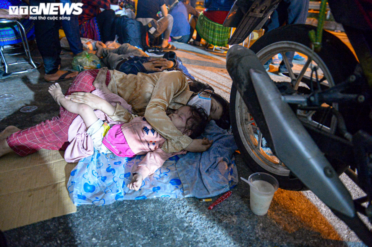 Hai mẹ con chị Sùng A Lính gục đầu trên chiếc áo mưa, cố chợp mắt để lấy sức cho hành trình hàng trăm km tiếp theo.