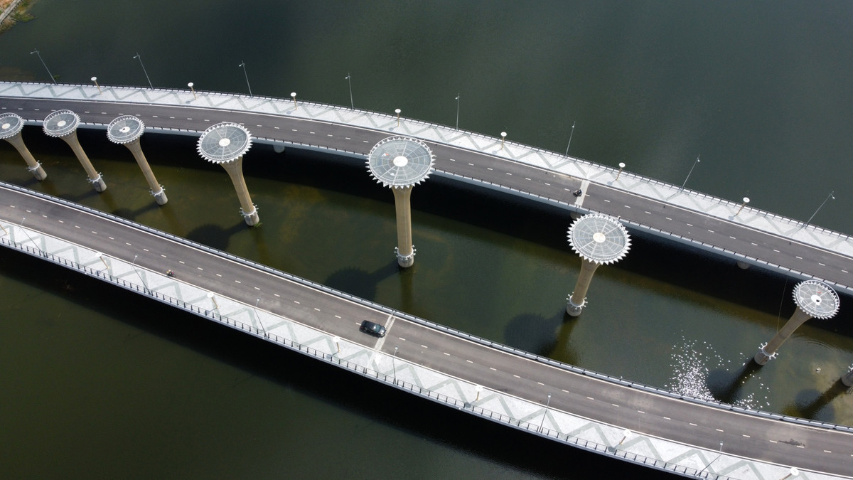 Nhìn từ trên cao có thể thấy rõ thiết kế đặc biệt của cây cầu với hai thân cầu tách rời tạo thành hình bầu dục lạ mắt. Theo thiết kế, cầu có cấp kỹ thuật theo tiêu chuẩn đường phố chính đô thị thứ yếu. Mặt cầu thiết kế theo tiêu chuẩn thiết kế cầu đường bộ gồm 2 đơn nguyên cầu độc lập được xây dựng vĩnh cửu bằng bê tông cốt thép và bê tông cốt thép dự ứng lực.