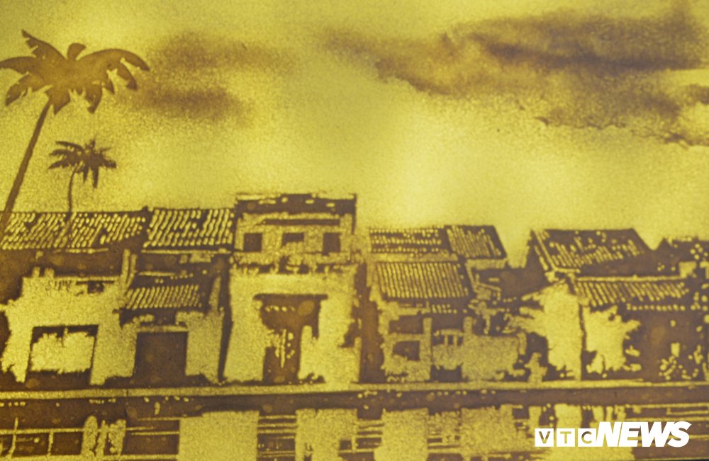 Bức tranh về phố cổ Hội An được phác họa trên nền chất liệu giấy làm từ dừa nước.