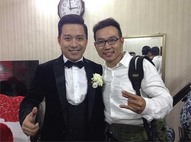 Chú rể cười rạng rỡ khi chụp hình với một anh bạn. Trong thời điểm xuất phát sang nhà gái đón dâu, Tuấn Hưng còn thoáng chút lo lắng nhưng đến tiệc cưới tại khách sạn, anh đã bớt căng thẳng hơn, luôn rạng rỡ chụp ảnh với bạn bè.