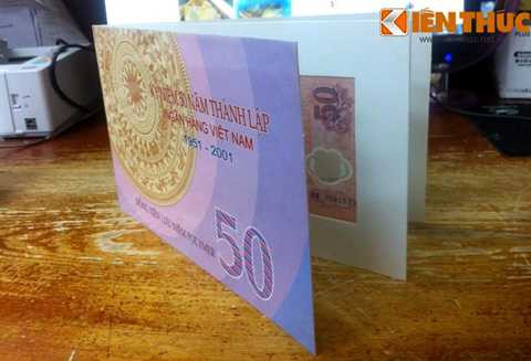 | Tờ tiền được đựng trong một Folder (quyển đồng tiền lưu niệm). Bìa ngoài của quyển đồng tiền lưu niệm mệnh giá 50 đồng có in hình trống đồng bên ngoài, còng chữ "Kỷ niệm 50 năm thành lập Ngân hàng Việt Nam (1951 - 2001). |