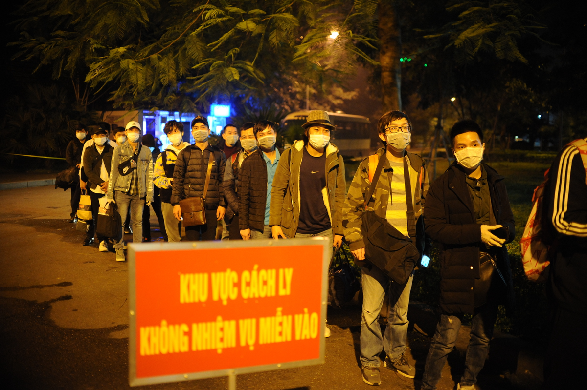 23h ngày 24/3, đoàn người cách ly đầu tiên gồm 28 thành viên về đến khu cách ly. Cả đoàn nhanh chóng xếp hàng làm thủ tục, được đội ngũ y tế hướng dẫn, khử khuẩn hành lý trước khi nhập phòng.