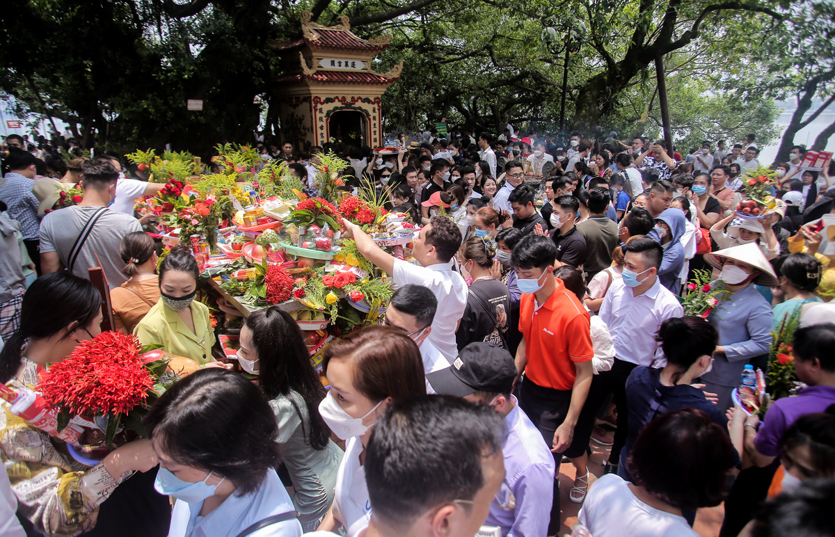 Thậm chí, có những người phải đưa mâm lễ lên cao để có thể di chuyển dễ dàng hơn. Không những vậy, vị trí bày đồ lễ trên ban không còn, nhiều người phải đội mâm lễ lên đầu và vái vọng từ xa.