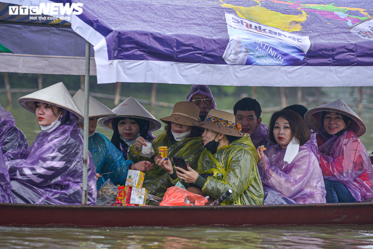 Do thời tiết sáng nay mưa rét nên nhiều người dân phải mặc áo mưa, mang ô trên thuyền xuôi dòng suối Yến.