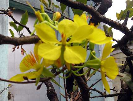 Những cây này chưa hề rụng lá, vẫn còn nguyên vẹn lá già. Trên cây, nhiều hoa đã nở rực, nhiều nụ hoa đang chực nở. Bất ngờ hơn nữa là số hoa nở trước đó đã kết trái và cây đang đâm chồi nảy lộc.