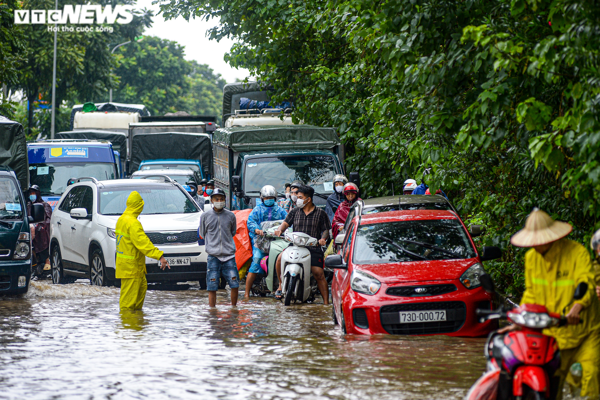Tới trưa cùng ngày, nhiều đoạn ở khu vực đi qua xã An Khánh vẫn mênh mông nước, cảnh ùn tắc giao thông xảy ra nhưng không nghiêm trọng.