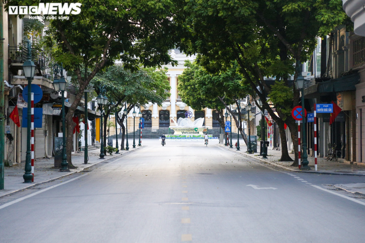 Lúc 8h trên đường Tràng Tiền (quận Hoàn Kiếm) thưa thớt xe cộ qua lại. Đây là một trong những con đường có mật độ phương tiện tham gia giao thông đông đúc nhất Thủ đô, trước khi đại dịch bùng phát.