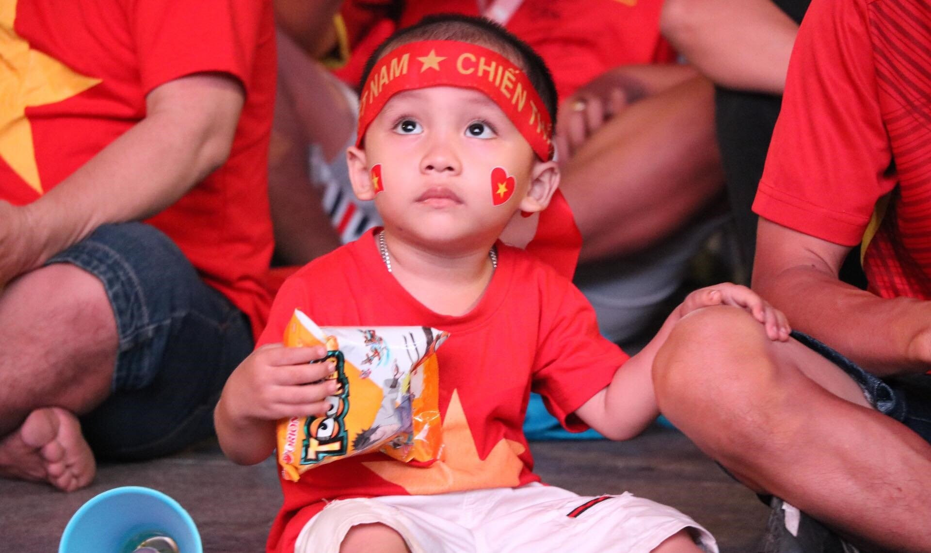 Nhiều em nhỏ cũng theo chân người thân đến phố đi bộ Nguyễn Huệ để cổ vũ đội tuyển dù trời có mưa lâm thâm.