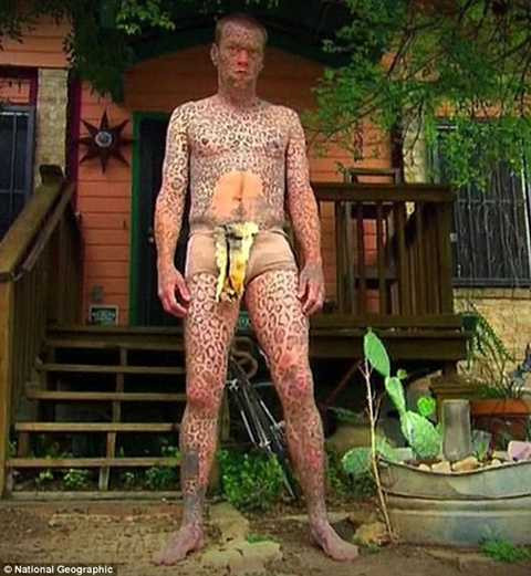 Larry Da Leopard tự biến mình thành người báo với nhiều hình xăm đốm trên cơ thể