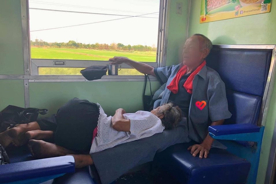 Hình ảnh bà lão nằm ngủ trên chân chồng trên hành trình dài đi tàu.